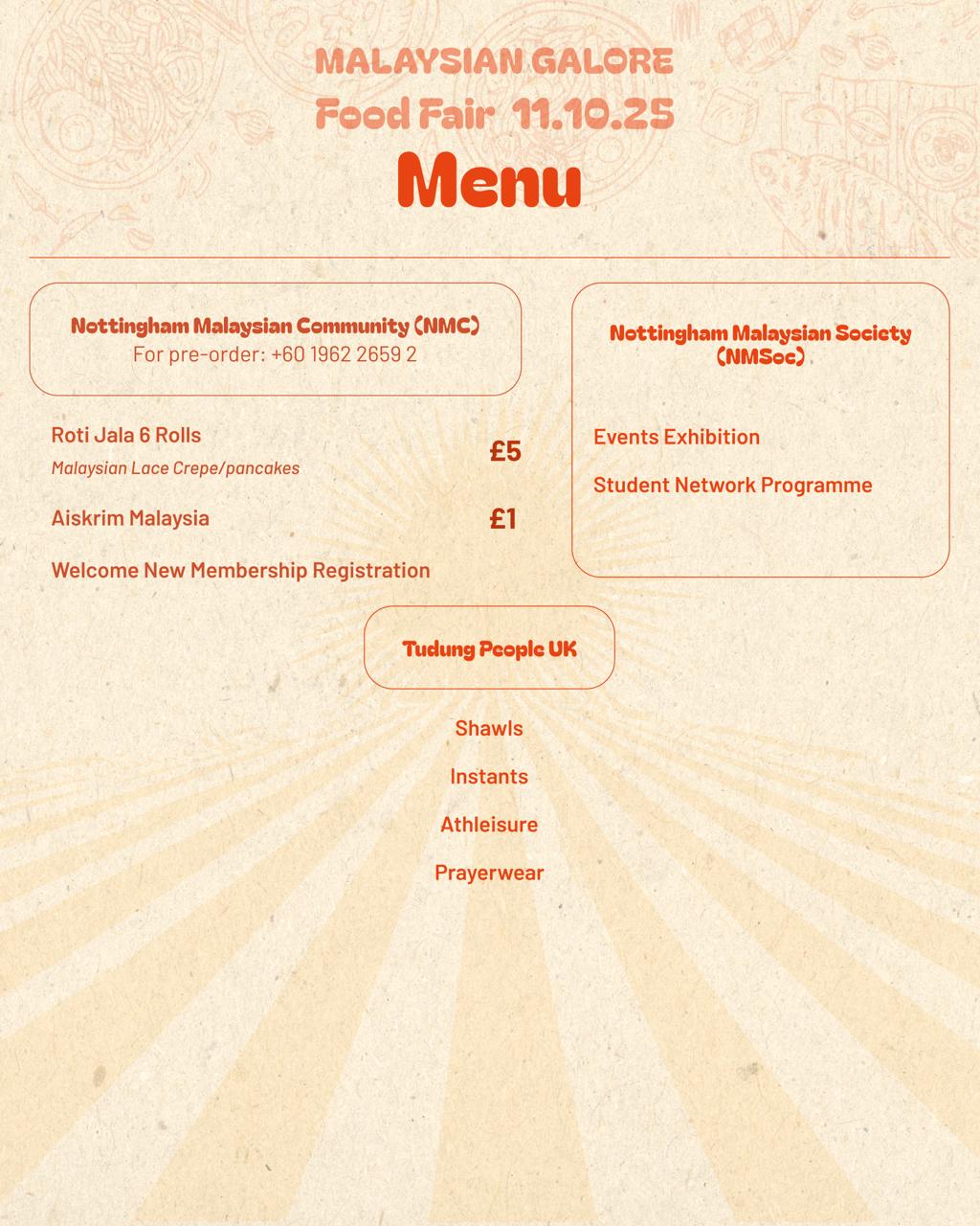 Malaysian Galore Food Fair is a FREE ticketed event with multiple food vendors serving delicious Malaysian delicacies! Hosted by Nasi Kandar Mydin Ali, in collaboration with Nottingham Malaysian Society (NMSoc), Maziah’s Makan, D’Rasa Birmingham, Kulilinari & Tudung People UK, with participation by Nottingham Malaysian Community (NMC).